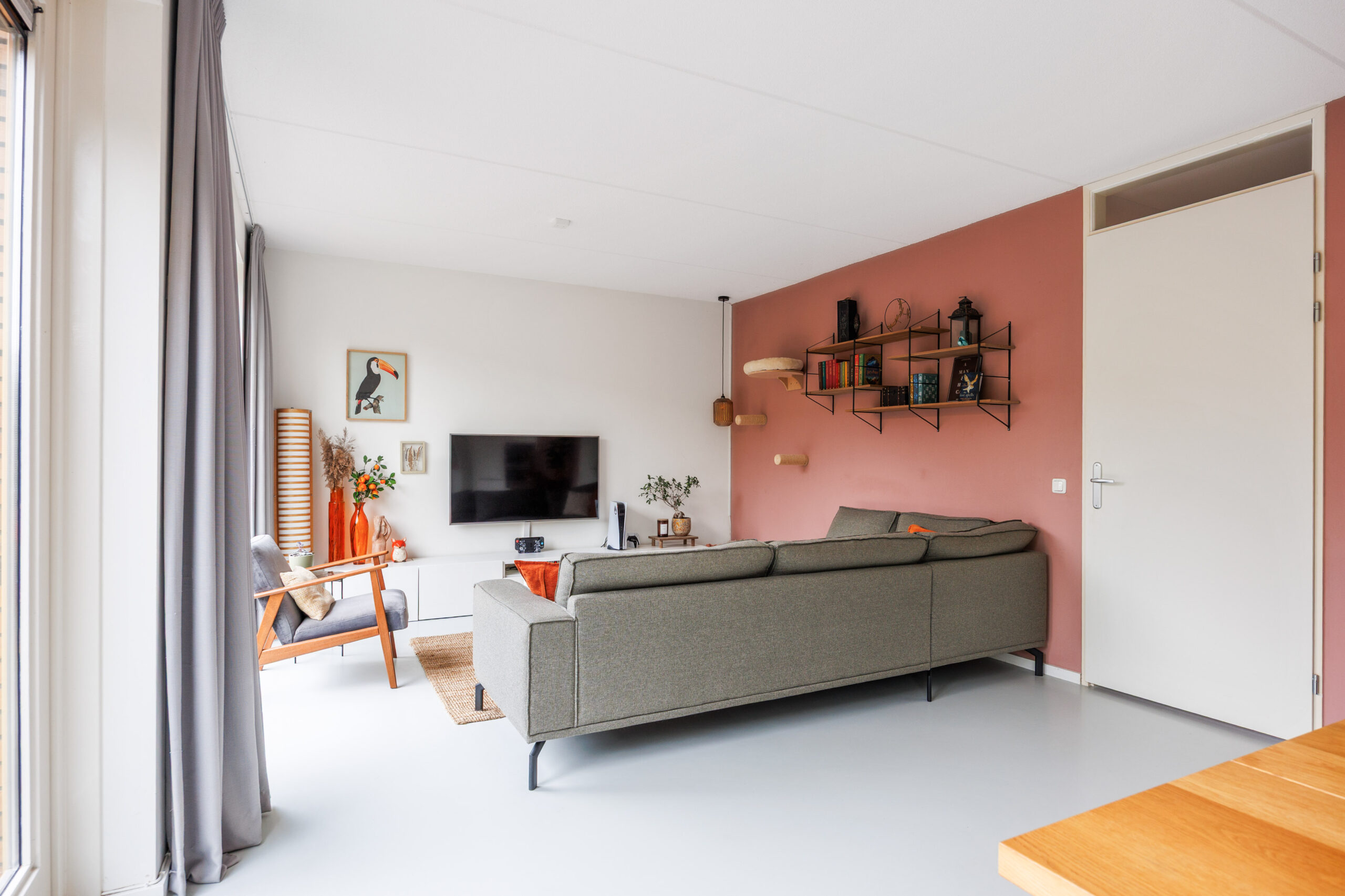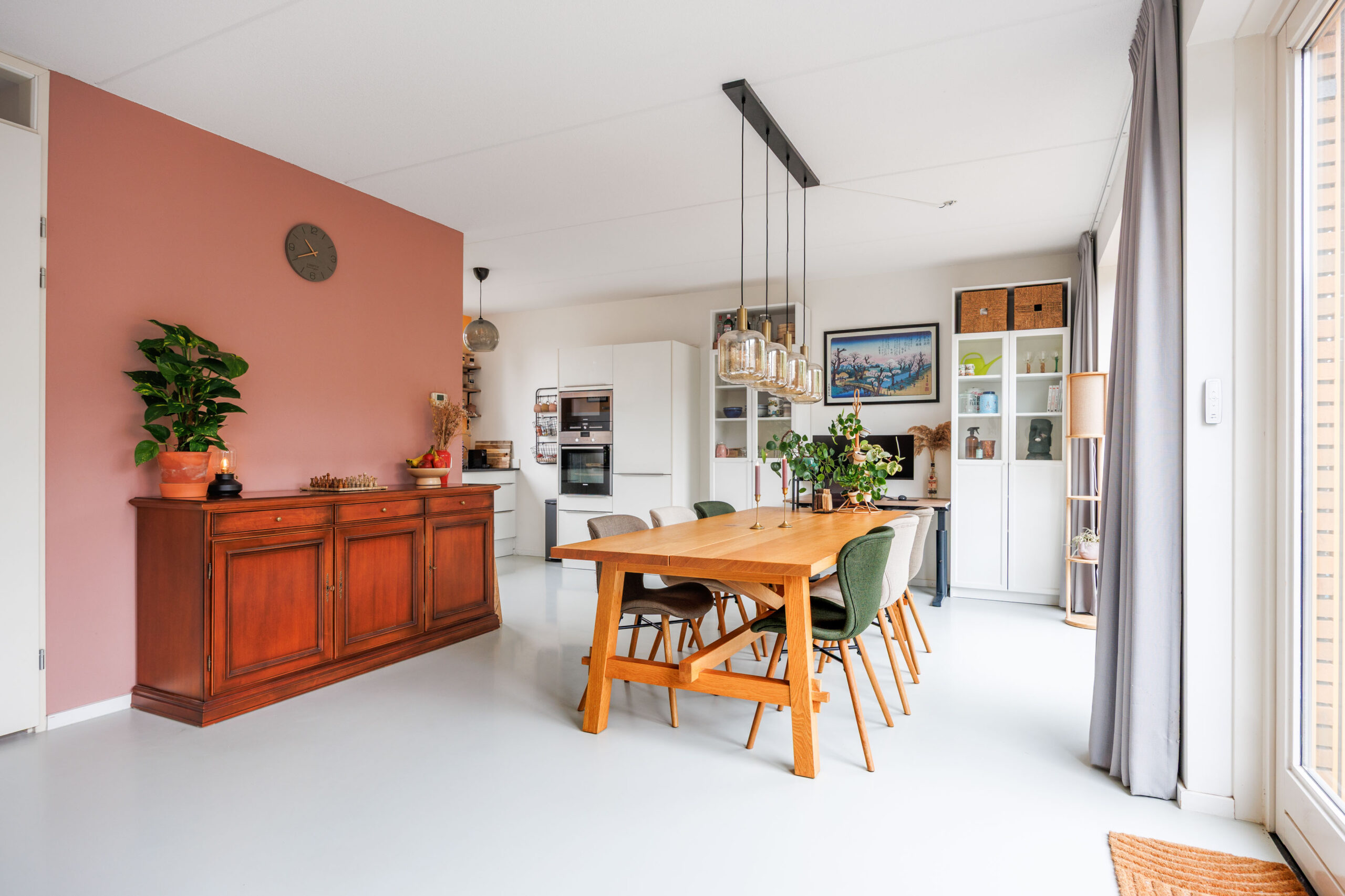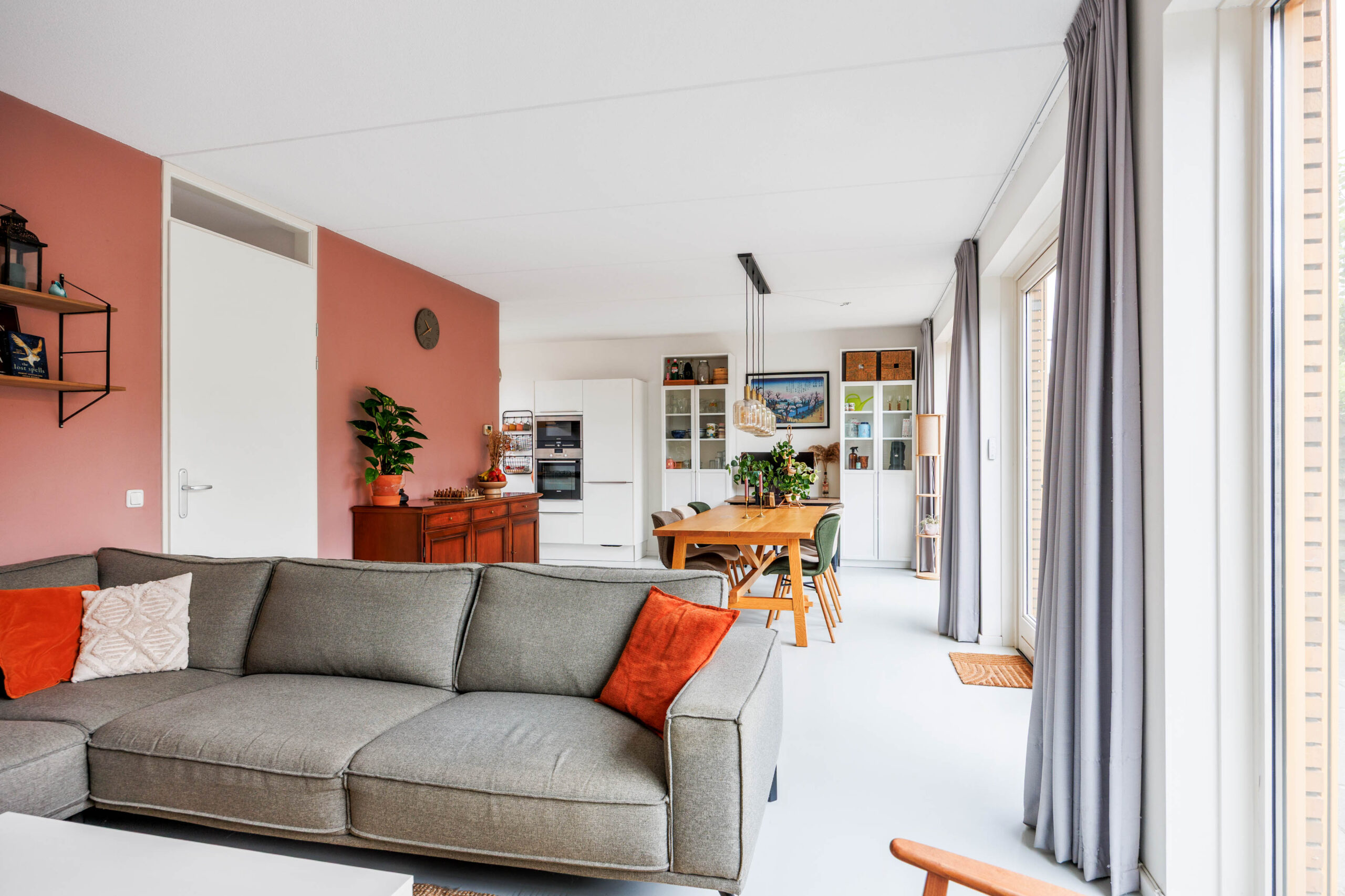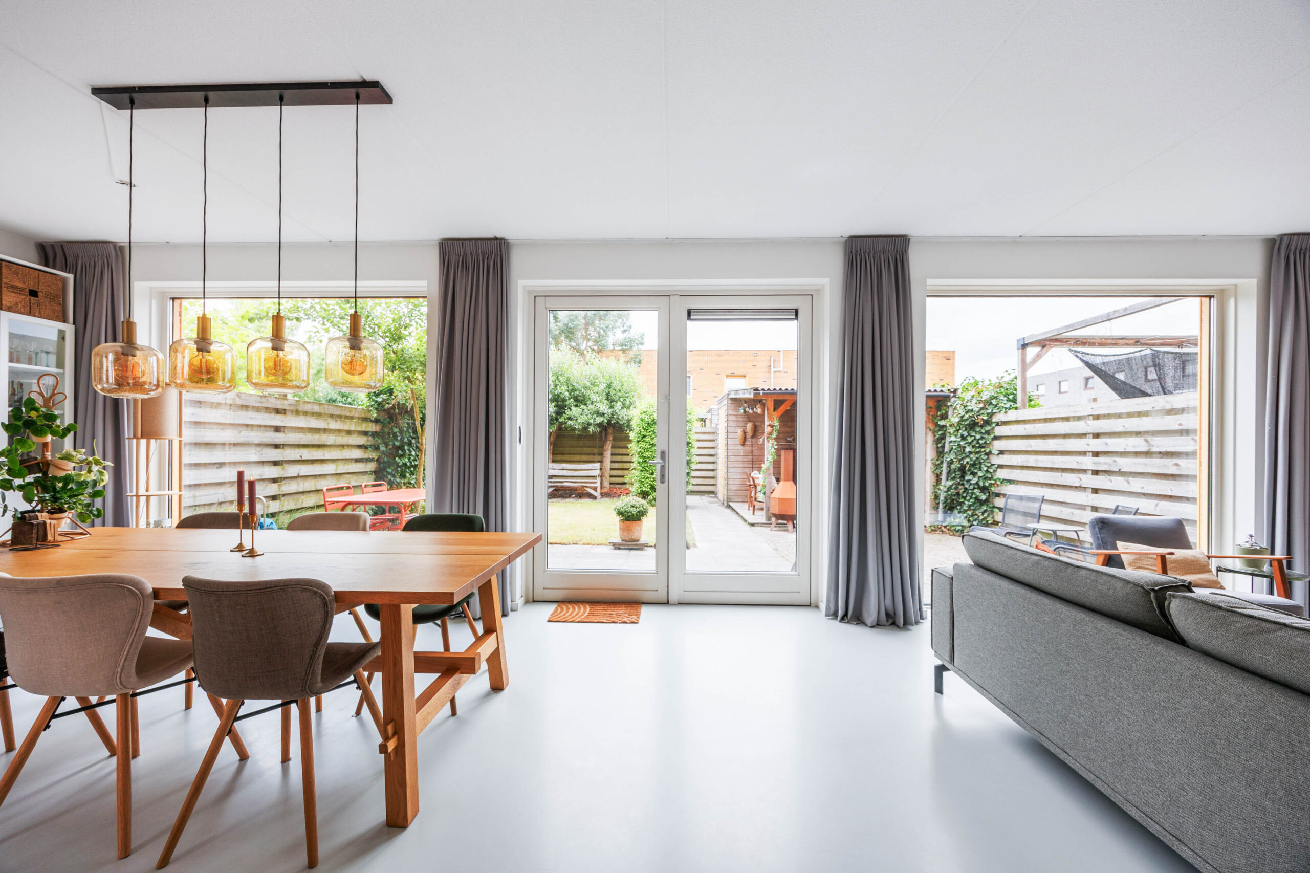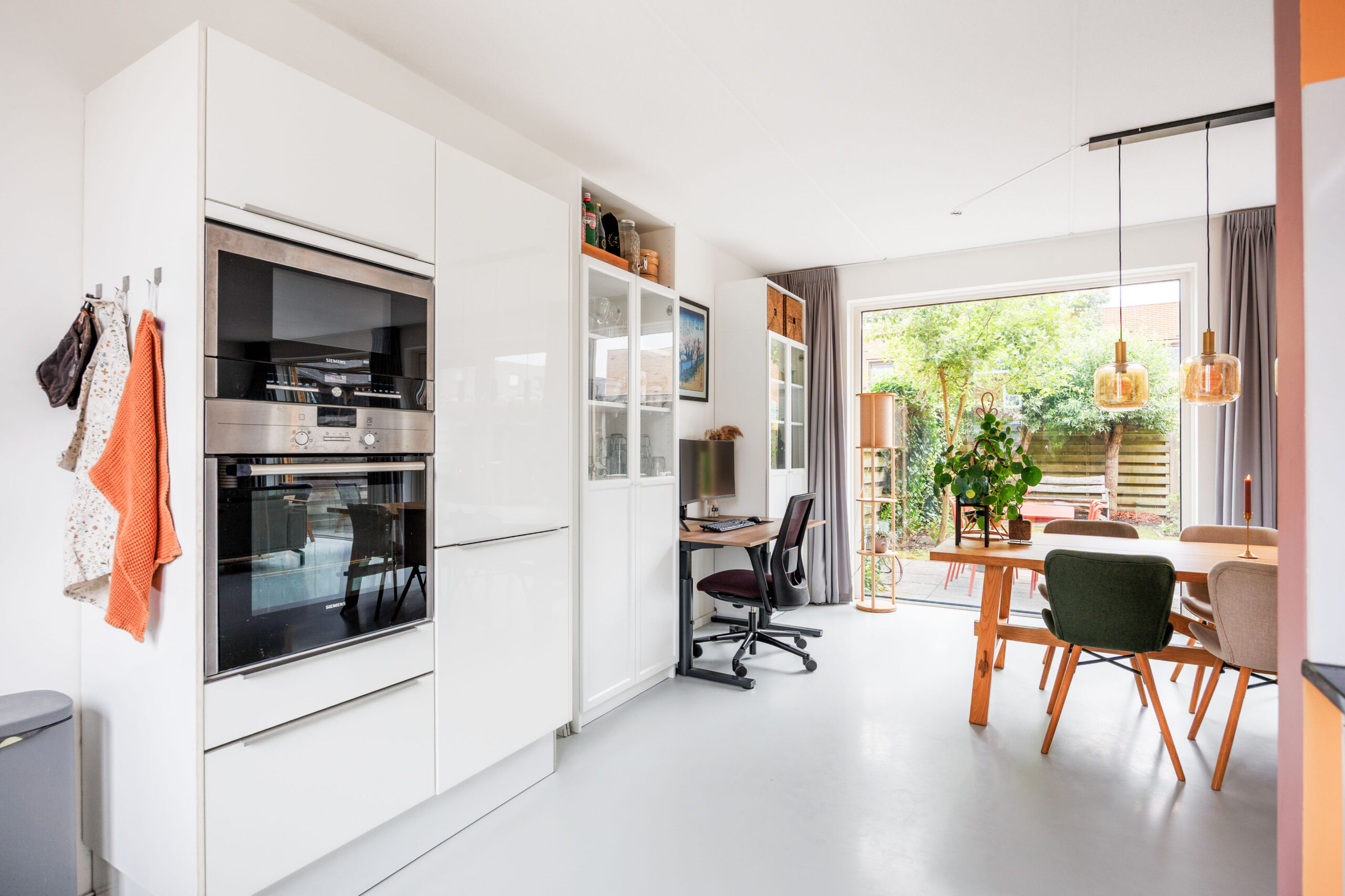 De royale woonkamer (ca. 43,1 m²) is tuingericht en voorzien van een grote glazen pui met openslaande deuren naar de achtertuin. Dankzij de breedte van de woning (ruim 9 meter) en de plafondhoogte van 2,64 meter voelt deze leefruimte bijzonder ruimtelijk aan. De vloer is afgewerkt met een moderne gietvloer inclusief comfortabele vloerverwarming, en er zijn zonwerende screens aan de achterzijde.