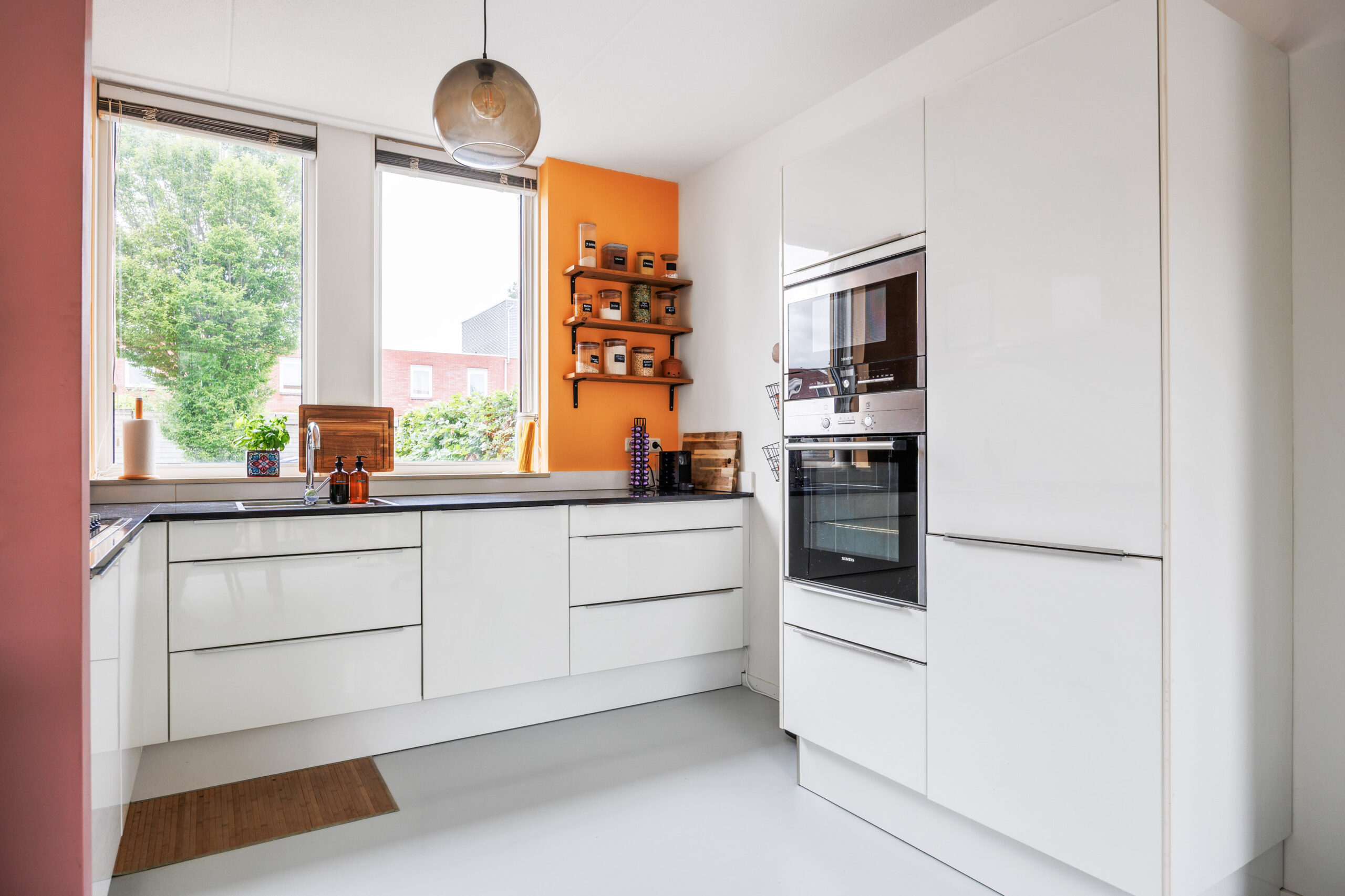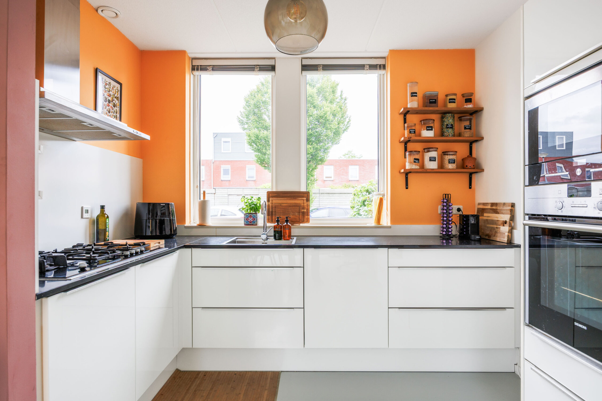 Aan de voorzijde bevindt zich de open keuken, die in directe verbinding staat met het eetgedeelte. De keuken is gesitueerd in een U-opstelling en voorzien van een groot raam met zicht op de voortuin, wat zorgt voor veel lichtinval.