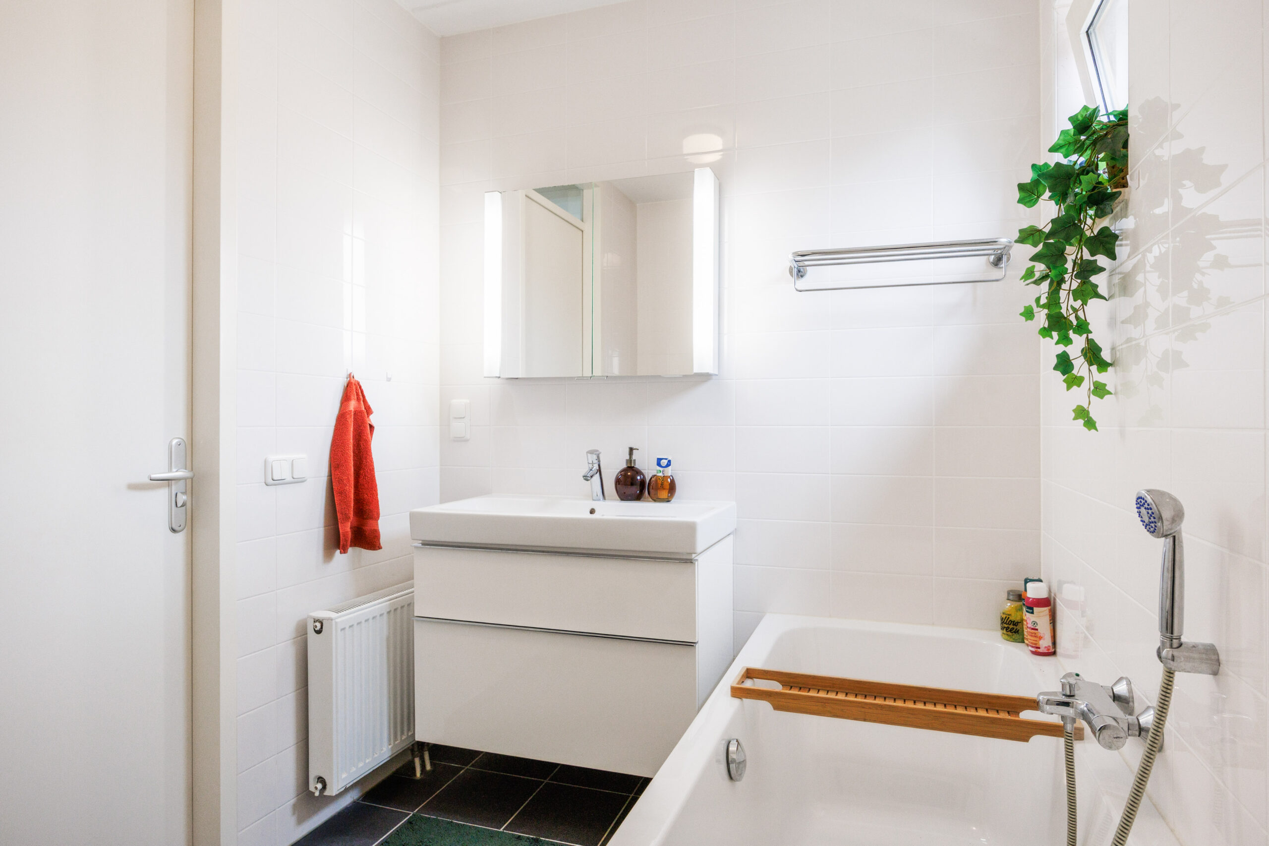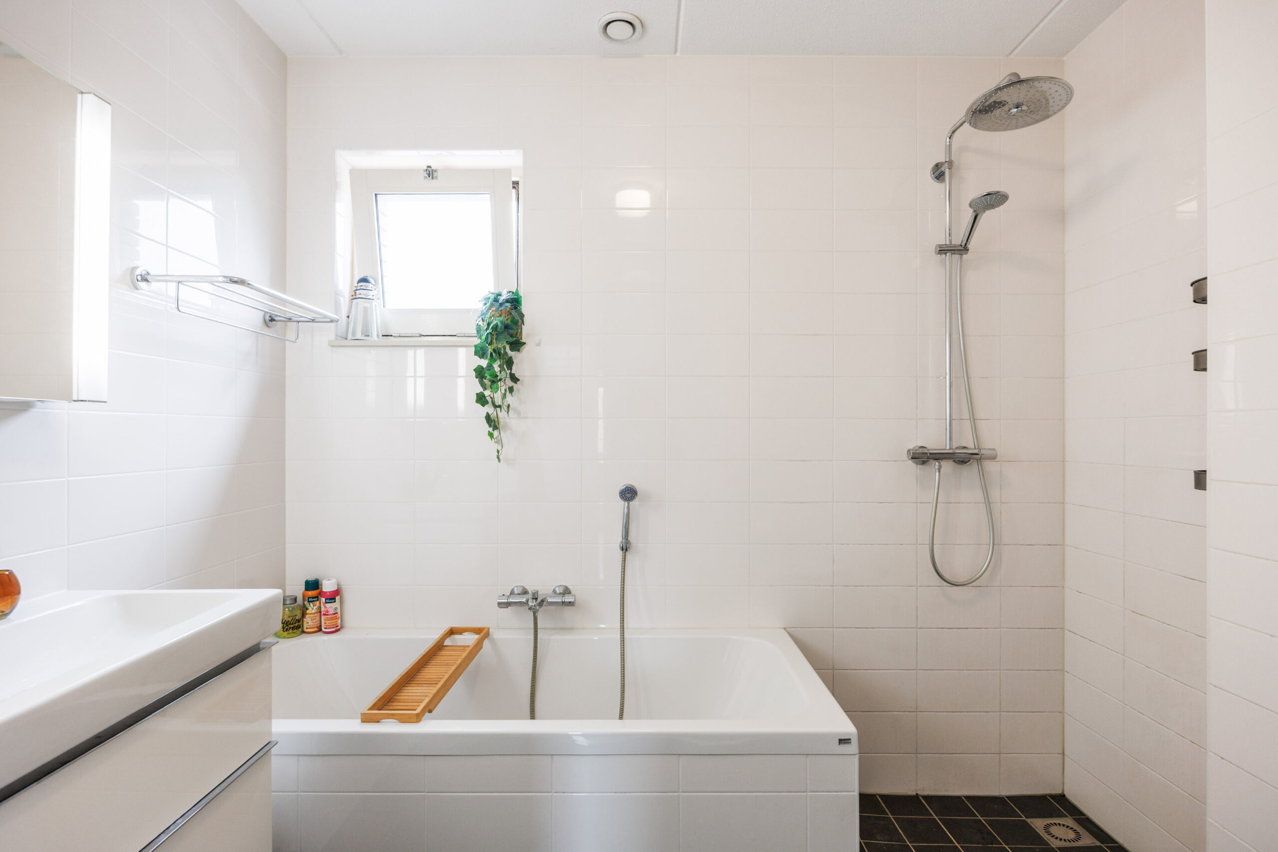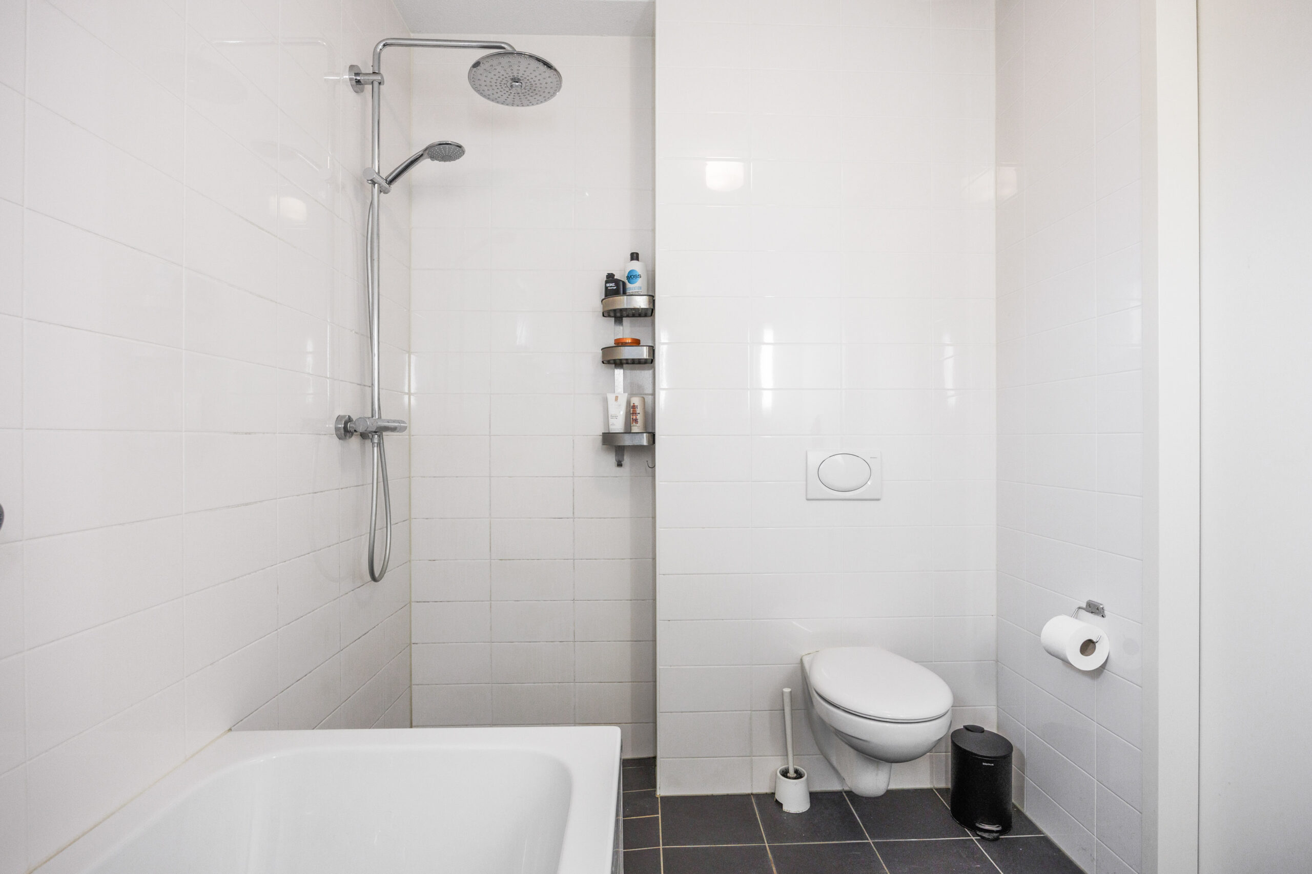 De badkamer (5,3 m²) is centraal gelegen en voorzien van een douche, wastafel en toilet.