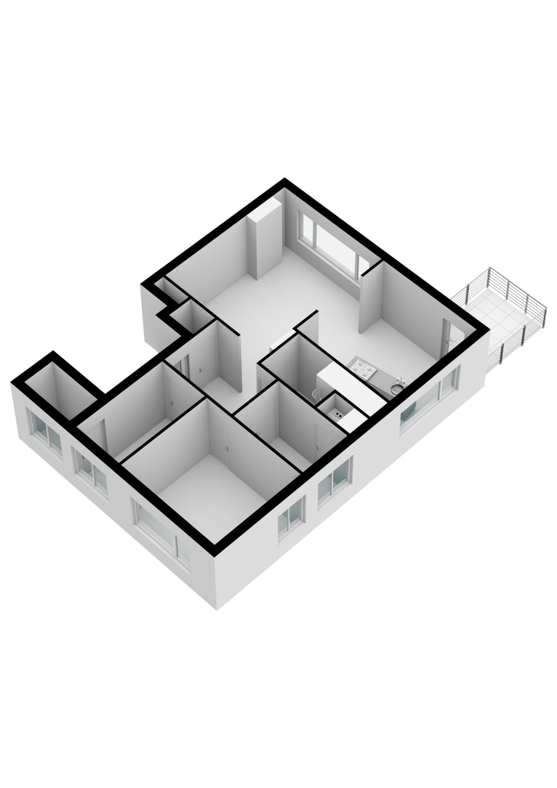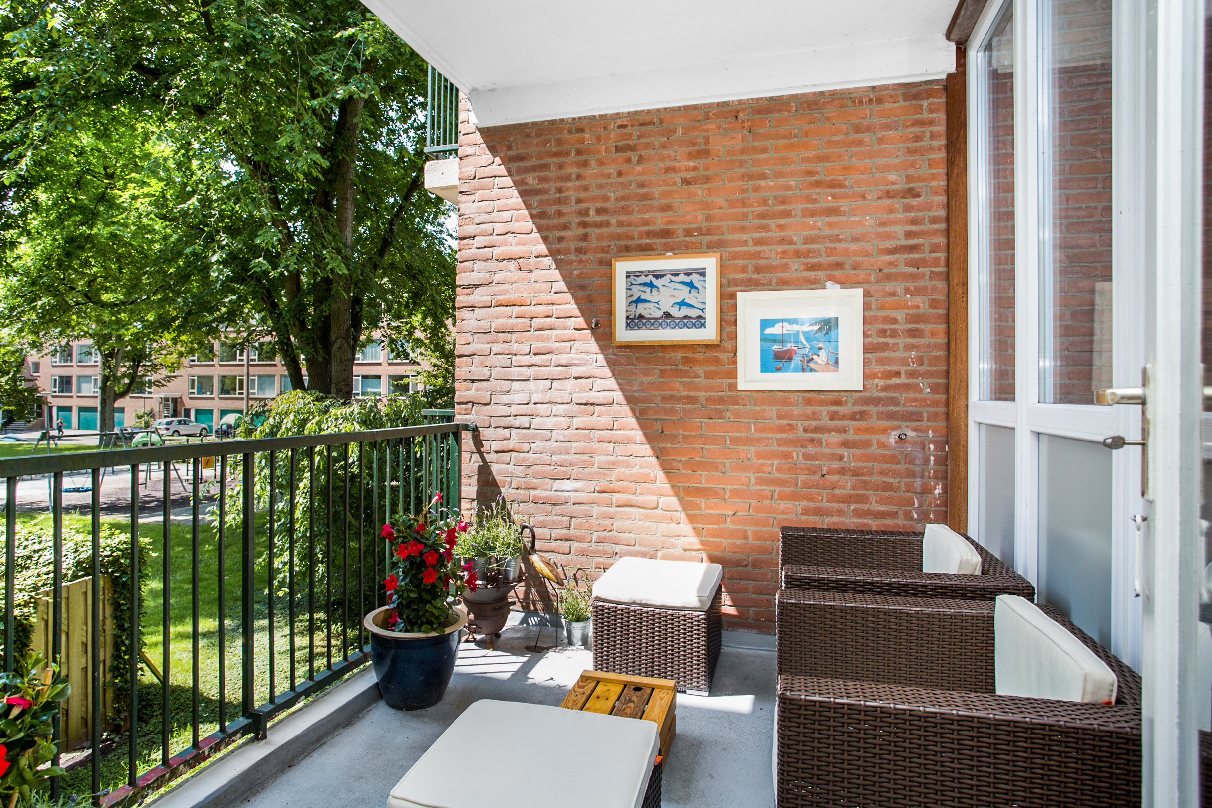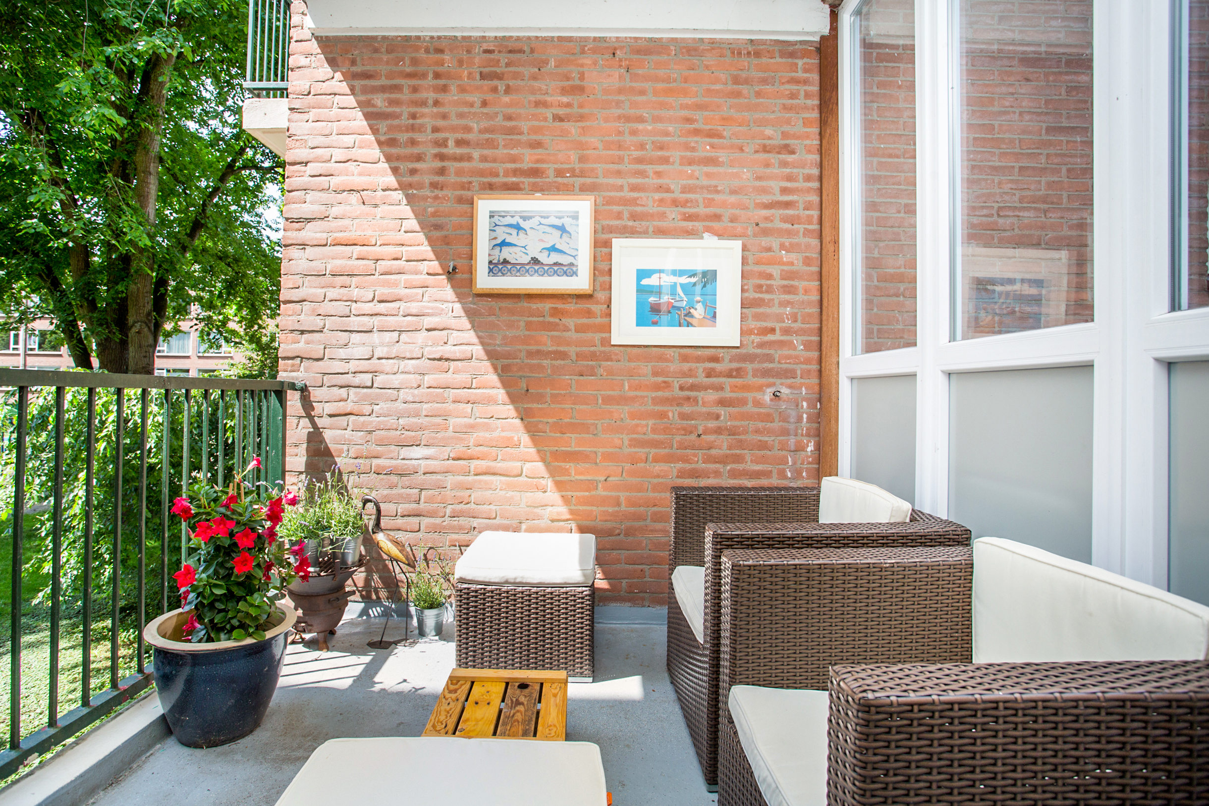 inpandige balkon die uitkijkt op een hof met speeltuin. Omdat dit balkon zich in de hoek