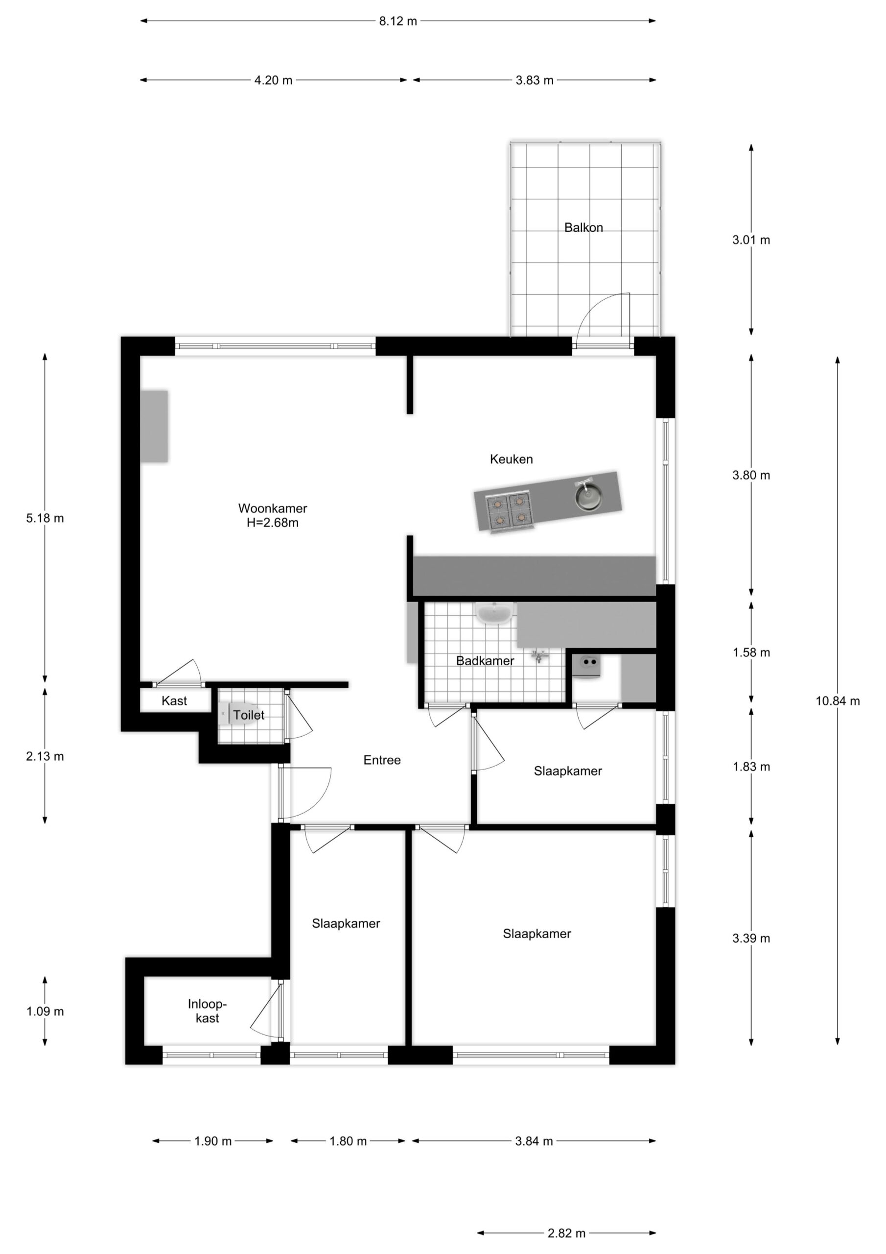 The apartment has 3 rooms and a large living room with a cooking island and built-in